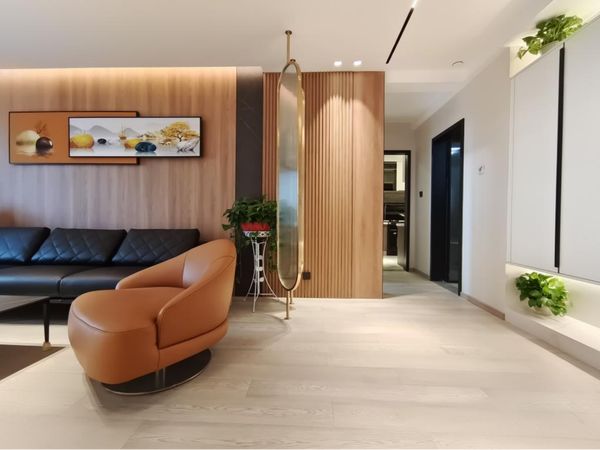 【乔峰】:好的,我有两个同样户型的案例可以分享一下。一个业主已经入住,兰州云府158,设计建筑面积115㎡的项目。这个房子是三室两厅两卫一厨,业主是一位90后的单亲妈妈,家里有一个孩子,还有两位老人。业主希望整体装修风格能体现都市小资气质,并且在声光水气方面可以重点设计,整体能体现空间感,动线清晰。为此,我为业主打造了港式风格的空间设计。我们知道,香港的室内设计潮流多以现代为主,大多色彩冷静、线条简单。港式风格家居,如果将整个居室的室内设计比喻成一部耐人寻味的电影的话,那么家居设计就是这电影中时时出现在关键时刻的电影配乐,或者说插曲。