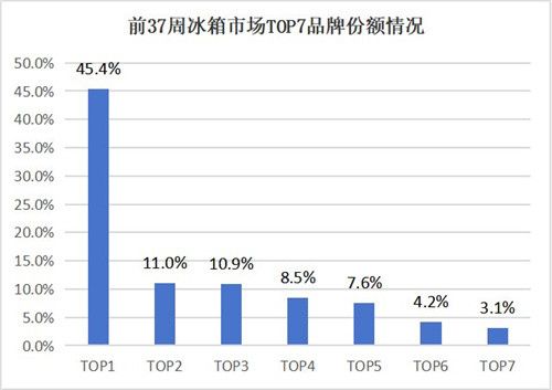 份额上,市场呈现“以一敌六”新格局。截至前37周,TOP7品牌占据90.7%的市场。其中,TOP1海尔冰箱份额达45.4%,TOP2-TOP7品牌的份额分别为11%、10.9%、8.5%、7.6%、4.2%、3.1%。也就是说,六家份额总和低于TOP1品牌份额0.1个百分点,相比去年“以一超五”的局面,海尔冰箱的品牌优势进一步拉大。
