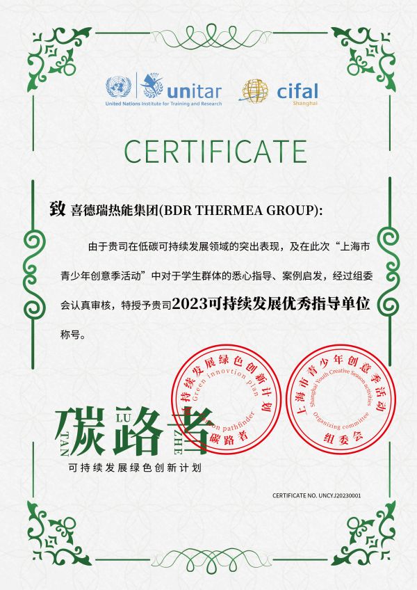 作为本届创意季活动指导单位及“碳路者 可持续发展绿色创新计划”优秀案例企业,喜德瑞热能集团(BDR THERMEA GROUP)由于在可持续发展领域的突出表现及对创意季活动参与学生群体悉心指导、案例启发,经组委会审核,被授予“2023可持续发展优秀指导单位”称号。