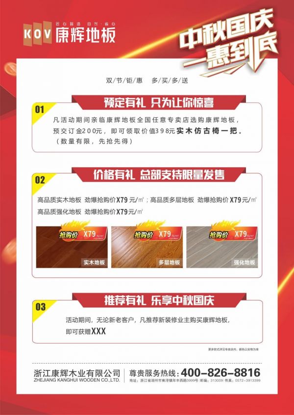 此次康辉地板在中秋国庆期间,为消费者带来预定有礼、价格有礼、推荐有礼等三大板块的活动内容,具体有哪些值得关注的惊喜福利?一一为大家解读。