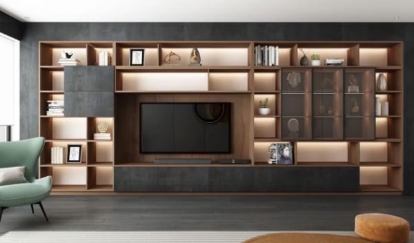 客厅选用不规则布局的电视墙,开放式格局打开视野,收纳也有空间,云影黑面板气质沉稳,整体配色上简单干净,简约又高级。