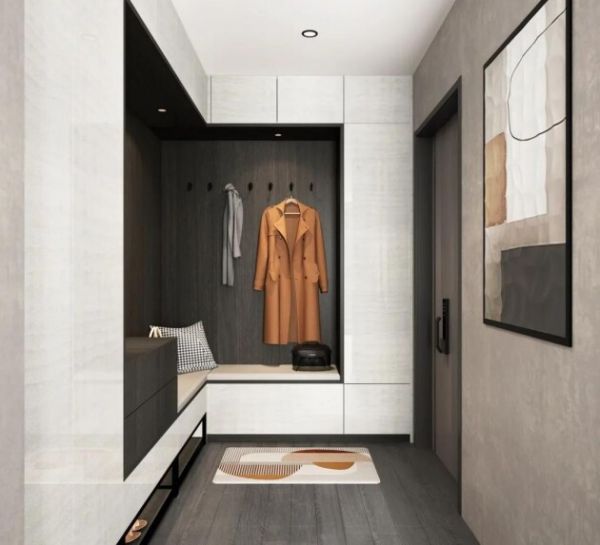 柏厨醉花间II系列玄关处,采用更贴合户型格局的L型设计,深色木纹与白色相接,典雅质朴,简约大方,内侧有小灯照亮实用满分还能增加氛围感,一侧设有半身镜和专属换鞋区,出入都能保持最好的状态,一侧设有挂钩方便日常进出的外套、围巾等挂放,镜子下方的小平台,让小东西也有处可放,不用手忙脚乱。