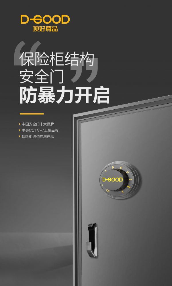 今年4月顶好尊品正式发布“第二代保险柜结构”安全门,并由国家知识产权局颁发了“保险柜结构”专利证书,顶好真正将产品的差异化和用户价值做到了极致!“保险柜结构”安全门,远超国家甲级标准,不止是防暴力开启时间,在锁点上也是比国家甲级标准多出5个,并且多配置了3个保险柜防撬栓以及防暴力高强度龙骨。
