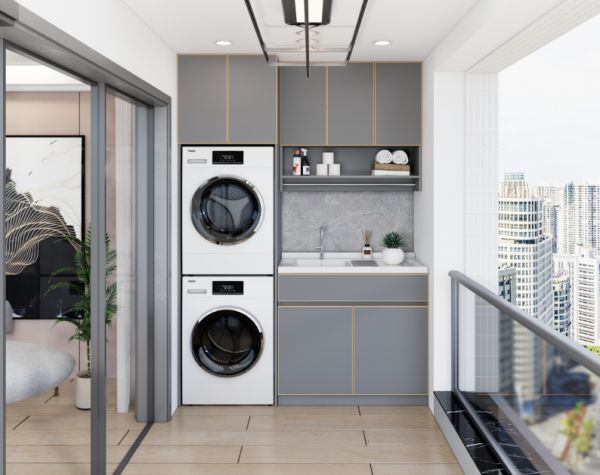 如果打算在阳台放洗衣机,那么必须事先做好线路改动,并将插座和水龙头都预留出来。而且,洗衣机的电源也不能直接安装在后面,否则就会有额外的充电空间,安装在水池下方才是最明智的选择!。