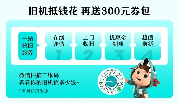 好在很多平台都有上线一键收旧活动,整个过程也十分简单,消费者只需要在线上进行简单的操作,即可完成。以“海信官方商城”为例,官方背书更靠谱,旧家电回收不限制品牌、品类。进入以旧换新模块后,通过线上录入旧机信息,可直接预估其回收金额,并由专人上门拉走旧机器。达成回收后,补贴海信购机优惠券包300元,其收旧款还可以直接用于购买新家电的抵扣。整个过程省心省力,无后顾之忧,对于打工人来说再方便不过了。微信小程序搜索“海信官方商城”进入首页,找到相应入口,便可以直接参与。