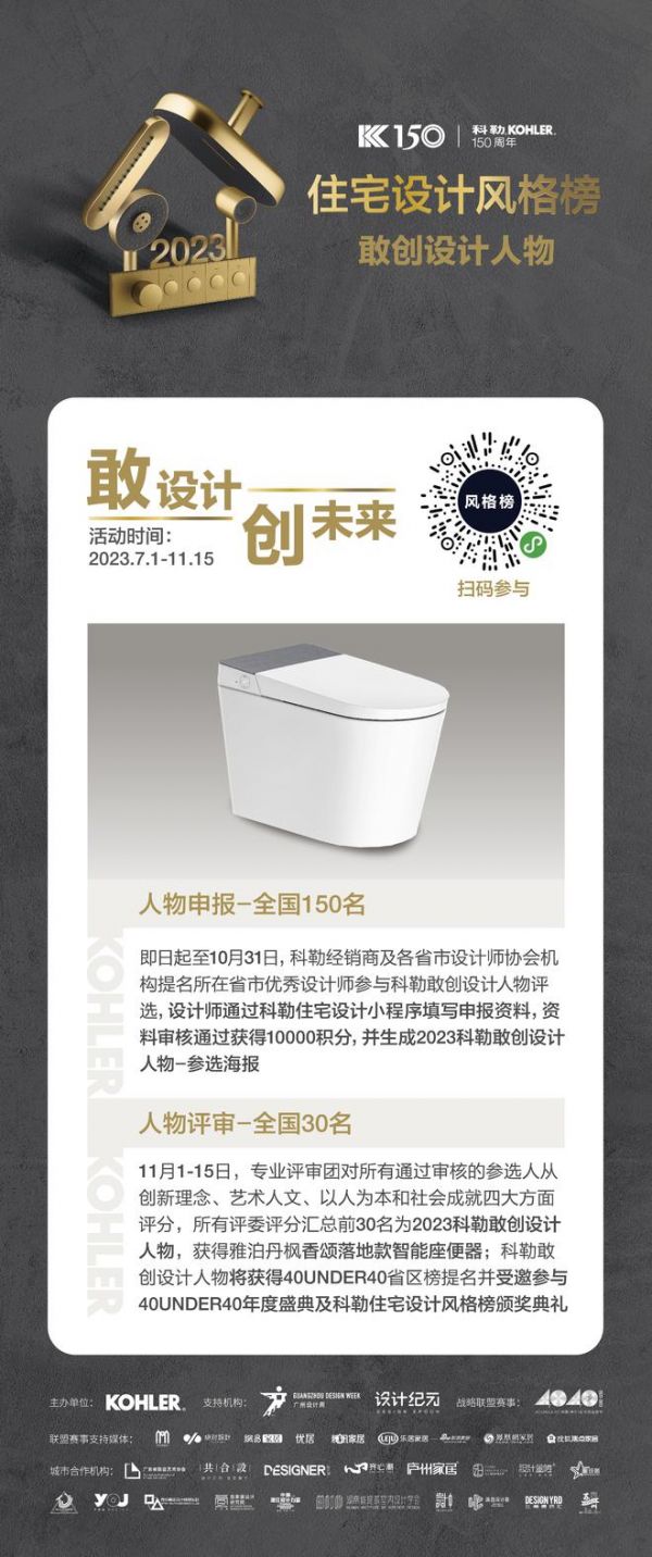 “2023年科勒住宅设计风格榜”在原有作品评选的基础上首度增设敢创设计人物评选,科勒将联合设计纪元、广州设计周及20个城市合作协会机构提名150位优秀的青年设计师参选人,并由评审团评选30位年度设计敢创人物,在设计圈及媒体平台持续传播,加持设计师个人IP塑造,成就设计行业中坚力量。