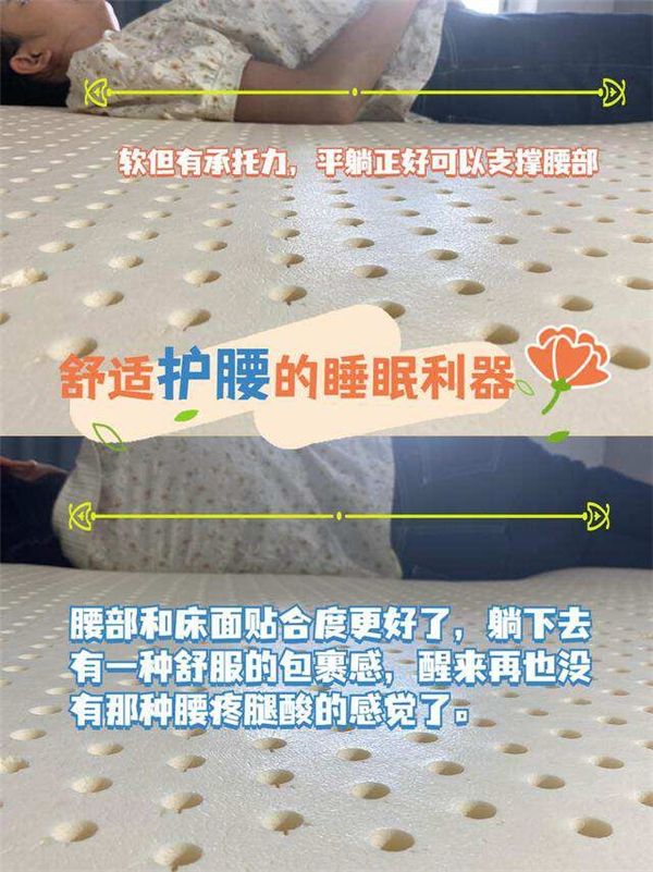 检查过没问题当晚我就直接睡了,初次体验觉得床垫软但有承托力,不是那种一睡就凹下去的感觉,平躺正好可以支撑腰部,不过第一次睡乳胶床垫有点不习惯,醒来腰还是挺酸疼的。第二晚再继续睡,腰痛减轻了60%左右吧,没有第一天那么痛了。后面接着睡了一周左右,能明显地感受到腰部和床面贴合度更好了,躺下去有一种舒服的包裹感,对身体是没有反作用力的,让人很容易放松下来更快进入睡眠中,醒来再也没有那种腰疼腿酸的感觉了。