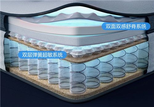 在这8层用料中,最为核心的是严选原创的“双簧结构”——大弹簧层由1020个大口径、多圈数、粗线径的加密独袋高弹弹簧组成,作为床垫的支撑层内芯,提供有力的支撑感。小弹簧层由2392个小口径、少圈数、细线径的高敏浮力弹簧组成,作为床垫的舒适层内芯,像素级灵敏响应睡姿变化,更好贴合身体弧度,精准分散体压。