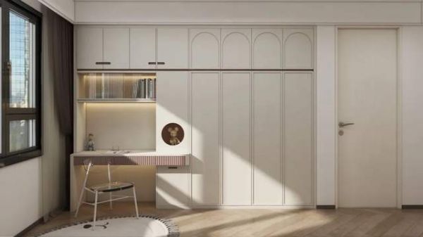 奶咖大面积运用,暖调撞色加以点缀为空间打造温柔滤镜。一门到顶的衣柜门增加法式拱形线条,增强精致度,生活仪式感拉满。
