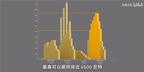 对电视来说,亮度高,则画面清晰,层次感好。UP主测评了三款电视的全屏亮度、峰值亮度及高亮度稳定性,结果显示:对比全屏亮度,三款电视相差不大;在峰值亮度上,海信电视最高达到4500尼特,而且高亮度稳定性更好,TCL峰值亮度也达到4000+,但稳定性表现不佳。TCL的最高亮度持续性不错但亮度值较低。