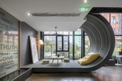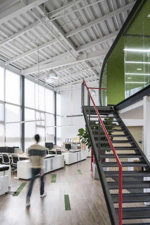 上海优鸿:优鸿上海总部办公空间是我们代表性作品之一。建筑原身是一栋国有老厂房,内部挑高10米,因此有着极大的发挥空间,我们结合室外建筑室内化的手法,实现在空间里造房子的想法。空间被划为三层,我们将”磁极”的形态贯穿其中,由外向内望去,两个“C”型“磁极”静默平行却相互吸引,象征着优鸿设计部与工程部之间的紧密协作。
