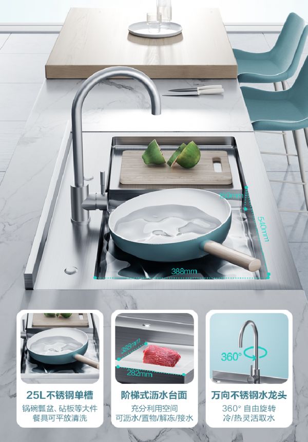 综合了大单槽的颜值和双槽的实用,在25L大单槽上做了阶梯式台面设计,颜值高,日常可满足备菜、沥水等多种需求;还有360°冷热两用龙头,实用美观。