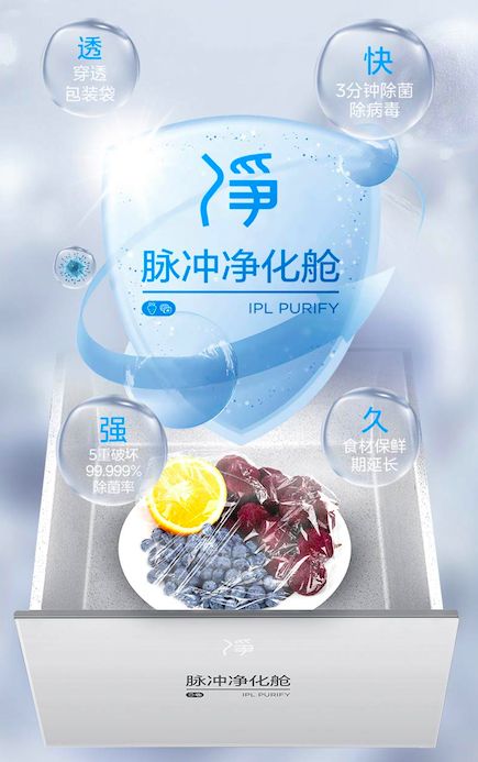 脉冲净化技术能穿透包装袋,直接对食材本体进行除菌,利用200~1000nm全光谱,包括紫外、蓝光、红光、红外等脉冲强光,对微生物的遗传物质、生理代谢、细胞结构、细胞壁进行五重破坏,短短3分钟,除病菌率高达99.999%,且已获得国际领先水平认证。更为人性化的是,脉冲净化舱还采用抗菌材质,实现双重守护,让你的冰箱始终保持洁净,从源头解决食材安全问题,让新鲜触手可及,为用户带来健康的饮食体验。