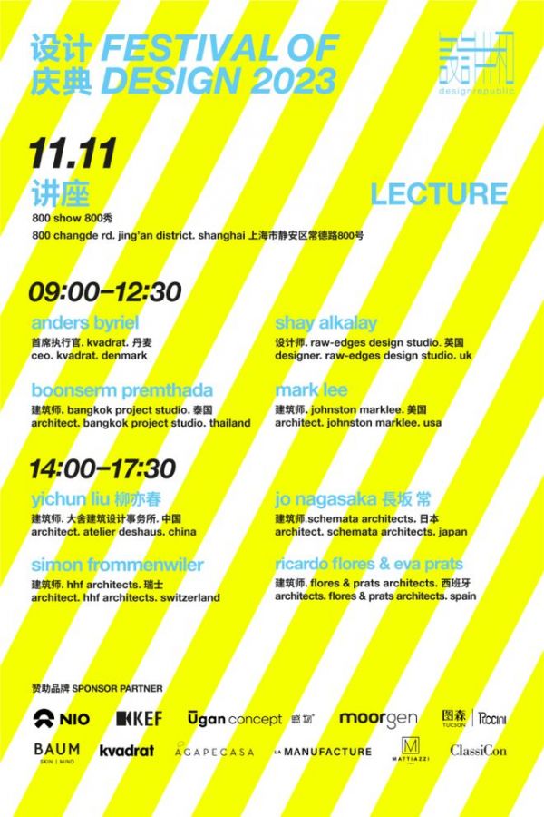此次线下讲座将于11月11日,09:00 - 17:30期间在八佰秀展开。讲座嘉宾包括Anders Byriel, Shay Alkalay, Boonserm Premthada, Mark Lee,柳亦春,Jo Nagasaka长坂常, Simon Frommenwiler, Ricardo Flores&Eva Prats。每位嘉宾将带来40分钟的精彩分享,并于上午和下午分别进行一场由郭锡恩与胡如珊主持的圆桌论坛。