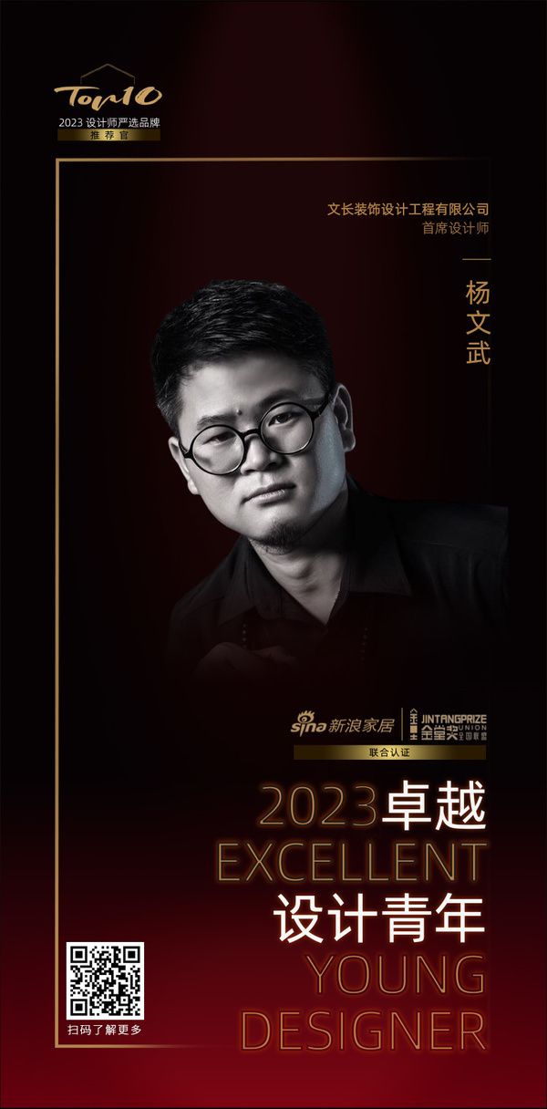 由新浪家居和金堂奖全国联盟发起的“2023卓越设计青年”,是设计业界最具传播价值的年度先锋荣誉,新浪家居与金堂奖联名认证,旨在发掘和表彰室内设计领域表现卓越的杰出青年设计师。设计师杨文武荣膺“2023卓越设计青年”称号。