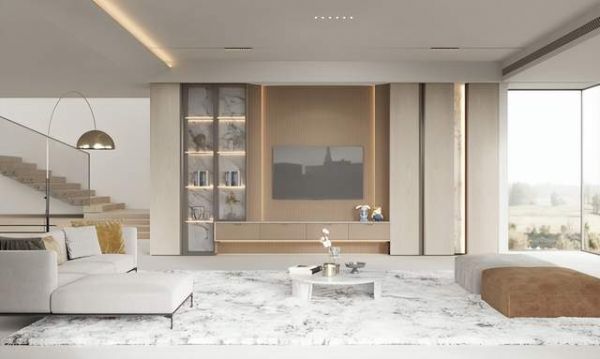 灵动石纹与卡罗拉胡桃的组合,与地毯相得益彰,营造温馨和谐的氛围,也让客厅更加宽敞明亮。