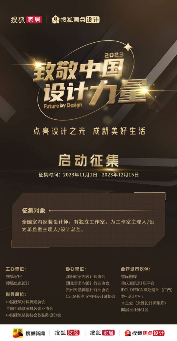 “致敬中国设计力量”重磅启动!项目由搜狐集团发起,室内设计师协会专业指导、搜狐家居和搜狐焦点设计联合主办,优选中国室内家装设计师,赋能城市美好人居生活!面向全国征集,并将对设计师优秀代表,进行荣誉认证和媒体宣传。