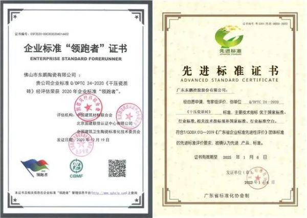东鹏制定的Q/DPTC 24-2020《干压瓷质砖》企业产品标准,规定了瓷质砖的术语和定义、分级、技术要求、试验方法、检验规则、标志和说明、包装、运输、贮存和订货等内容,并按各主要技术指标设定了所对应的优等品、一级品的质量分级要求。该标准主要技术指标中:“边直度、直角度、表面平整度、吸水率、破坏强度、断裂模数、耐磨性、地砖摩擦系数、抛光砖光泽度、耐污染性及抗化学腐蚀性”等技术指标优于国家标准、行业标准要求,“表面质量和放射性核素限量”技术指标填补国家标准、行业标准空白。