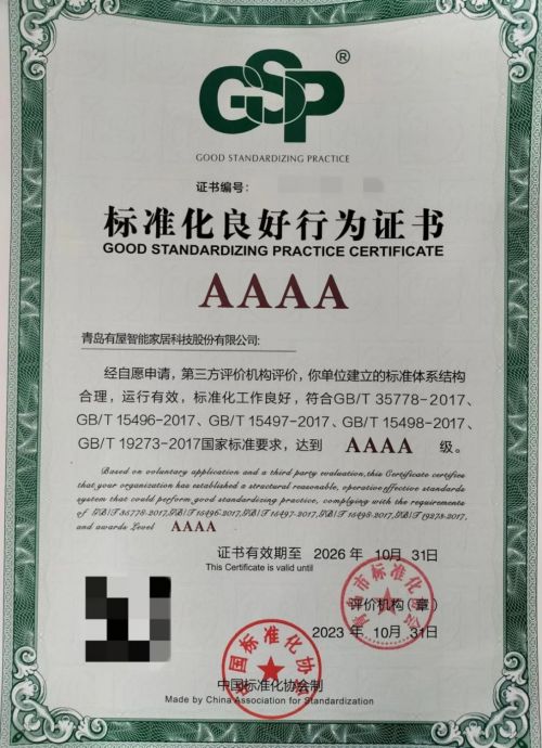 近日,有屋智能顺利通过标准化评审,获得AAAA级企业标准化良好行为证书。