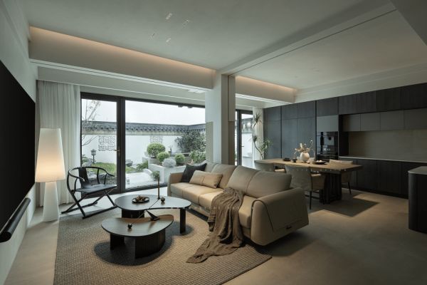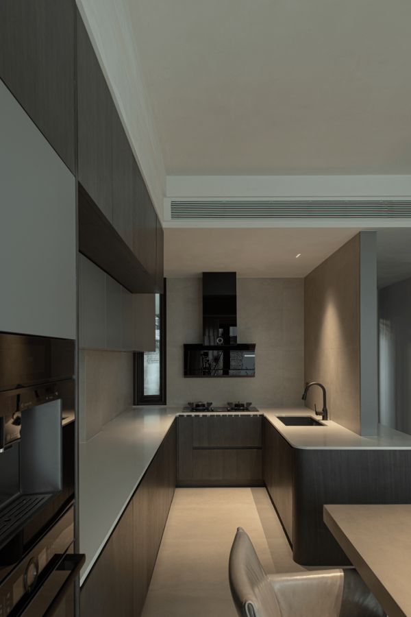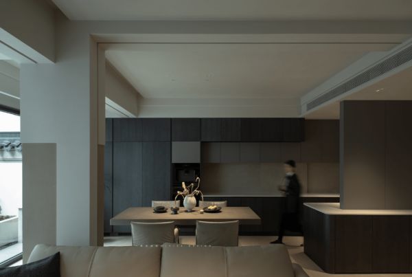 呼之欲出的自然情绪在波动的心跳中层层流转,在静水流深中层层递进,简单的灯带勾勒空间的大致模样,最自然的光照大面积地播撒进来。从自然中获取居住的智慧,厨餐客厅的打通营造了开阔的空间结构;从入户过渡至厨房,仅用了半面墙区隔;既出于鞋柜收纳功能的考虑,又能够兼顾卫生间隐形门的需要。空间的一体化在寥寥几笔中,达到了相融为一又各自美好的状态。