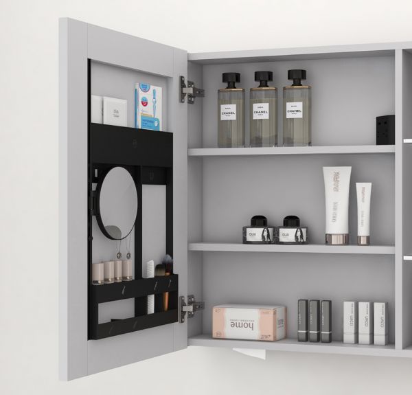 人性化设计:这款浴室柜还配备了按压式开门、化妆镜、镜箱充电功能等,让你的使用体验更加舒适、安全。镜箱内置增加插座设计(5孔+2USB),安全电压可匹配吹风机、电动牙刷、手机等充电需求,让您的卫浴生活保持“满电”。