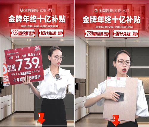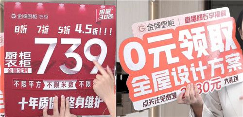 同样以此前【金牌厨柜】发起的“金牌年终十亿补贴”活动为例,金牌厨柜的围绕该活动不但进行了顶通氛围的装修,还通过“KT版展示低价折扣卡,加强视觉冲击”“实时展示板材质量,提高品质信任度”等步骤,帮助观众融入大促氛围,从而踊跃参与直播间活动。