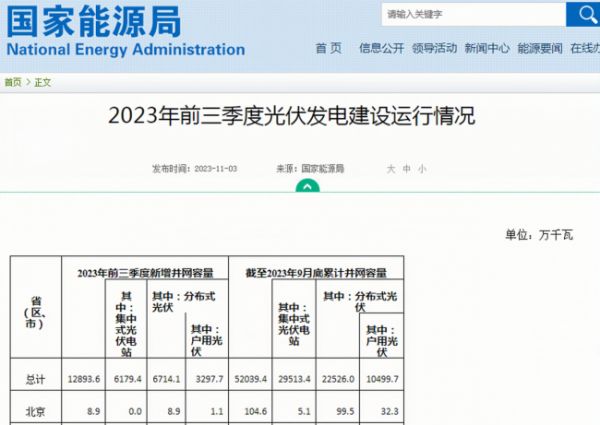 从国家能源局官网查看得知光伏发电建设和运行情况。2023年前三季度,全国光伏新增装机12894万千瓦,同比增长145%,其中集中式光伏6180万千瓦,分布式光伏6714万千瓦。截至2023年9月底,全国光伏发电装机容量达到5.2亿千瓦,其中集中式光伏2.95亿千瓦,分布式光伏2.25亿千瓦。2023年前三季度,全国光伏发电量4369亿千瓦时,同比增长33%。全国光伏发电利用率98.3%,同比提升0.3个百分点。