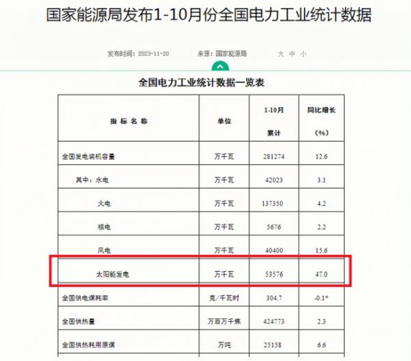 截至10月底,全国累计发电装机容量约28.1亿千瓦,同比增长12.6%。其中,太阳能发电装机容量约5.4亿千瓦,同比增长47.0%;风电装机容量约4.0亿千瓦,同比增长15.6%。