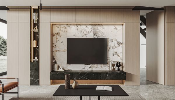 一体化墙柜门设计将电视墙与柜门完美结合,内嵌式电视柜设计巧妙,纵向拓宽了空间布局。简约大方的线条掩去对空间的修饰与加工,表现出浑然一体的装饰美感,低调优雅但又不失整体性。