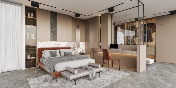床头储物吊柜的设计,使得物品的存放更加方便和有序。而月影胡桃饰面与天然大理石花纹的碰撞,又在无言之中诠释空间优雅轻奢的气质格调。