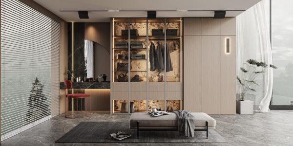 铝框玻璃衣柜内置叠放区、挂衣区和抽屉区,满足多样的收纳需求。罗浮幻象石纹背板搭配朦胧灯光,缔造空间视觉亮点,将都市的时尚感镌刻进每处细节。