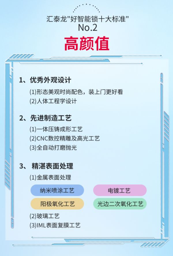 高颜值:汇泰龙智能锁要求外观设计出色、制造工艺先进、表面处理精湛,是对品质生活的追求。外观呈现出来的每一面,都考验着设计及工艺水平。因此,高颜值是好智能锁的重要标准之一。