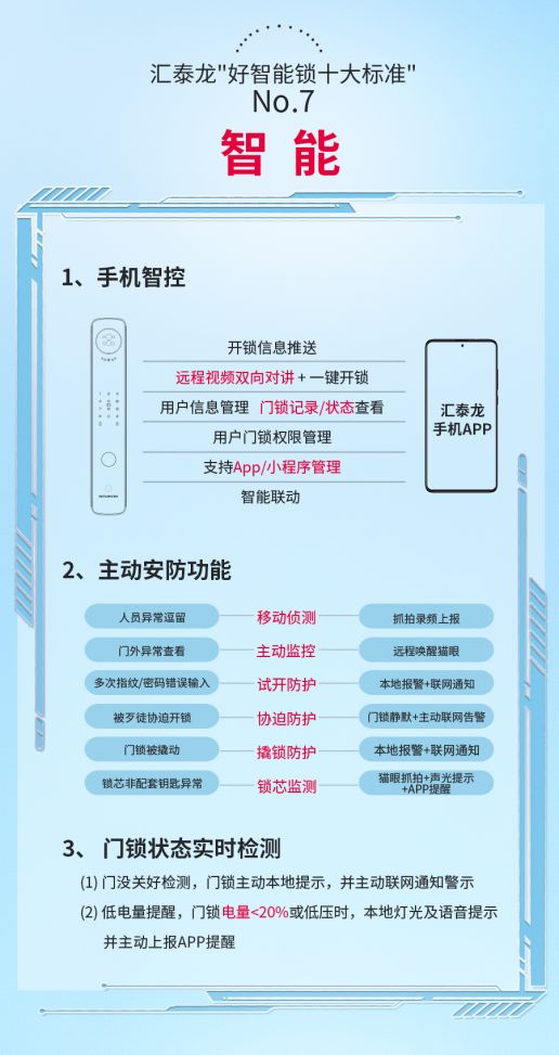 智能化:汇泰龙智能锁支持手机智控,远在外地也可以轻松了解家门情况,手机远程视频/双向对讲/一键开锁等功能,还能让用户更自若地处理客人来访等情况;拥有移动侦测、主动唤醒猫眼、防撬预警、胁迫开锁防护、试开防护等主动安防功能,智能守护更安心;以及实现涵盖闭锁监测、低电量提醒的门锁状态在内的实时监测,更好的满足深层次需求的智能功能。