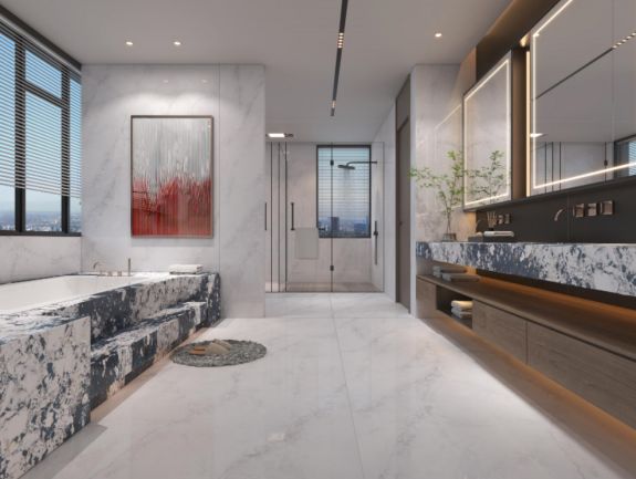 高颜值卫浴私密空间,配备双台盆+干湿分离淋浴+独立浴缸,让仪式感无处不在,大花纹奢石洗手台盆和浴缸成为点缀浴室的艺术品,台面下方设计柔光灯带,勾勒奢华的卫浴空间,完美适配星级酒店以及现代人对品质生活的追求。
