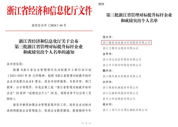 捷昌驱动获评“2023年度浙江省管理对标提升标杆企业”