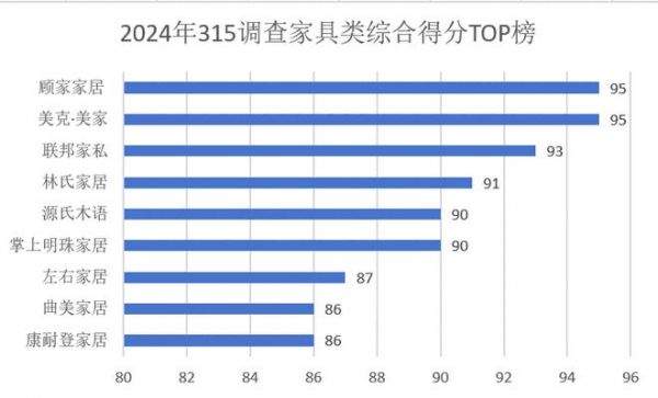 在本次315家居服务调查中,顾家家居和美克·美家95分高分并列第一。调查涵盖了家具行业消费服务的多个板块,包括设计、安装、售后等等。整体而言,本次315家居服务调查家具类品牌综合平均分达到81.42分,共有10家品牌分数超过85分,成功入围2024年网易家居315服务调查TOP榜。