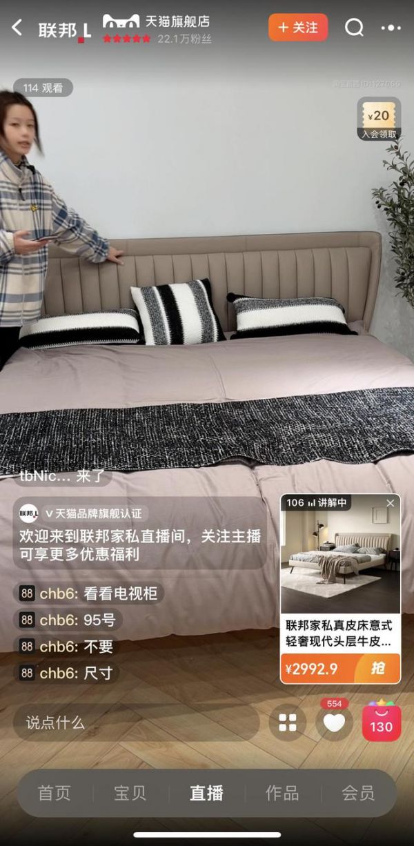 由于对线上渠道的重视,家具品牌的线上平台建设大多相当成熟,服务更加多元化。例如,大多数品牌的电商平台都可以进入品牌直播间,主播不断地介绍新品及优惠活动。例如,联邦家私的天猫旗舰店,消费者进店之后下拉就可以进入直播间,主播详细讲解产品设计、材质等优势以及优惠活动,消费者可实时互动,并提出问题。品牌与消费者之间的沟通更加便利和有效。