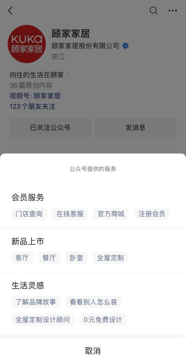 同时,顾家家居的微信号不仅有门店查询、在线客服、官方商城等,还提供“生活灵感”板块,让消费者“看看别人怎么装”或者领取“0元免费设计”等,在单渠道上力图给到消费者更多体验。而源氏木语的公众号更是在关注之后跳出抽奖页面,并引导消费者参与任务,以加强互动,收集消费者反馈。