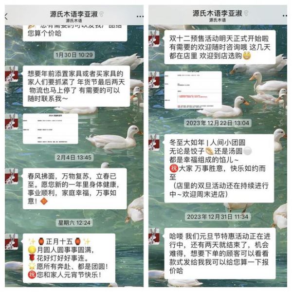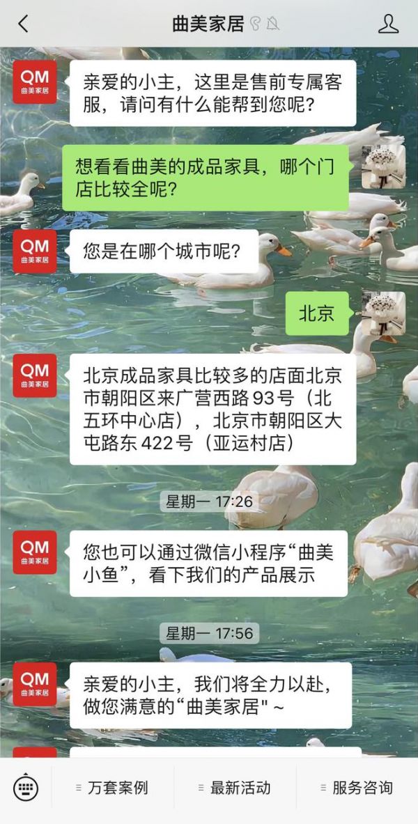 在线下部分,各品牌同样展现出不少亮点。例如,康耐登导购给调查员详细介绍了沙发的表面材质、填充物和框架,指导区分可更换定制的几种不同工艺真皮的适用性。而爱依瑞斯的店员不仅推荐全屋套餐,更表示能够根据客户所选产品,进行量房和其他产品的搭配设计。曲美家居的销售人员不仅详细介绍产品优劣,更是积极推荐配套设计,并主动提及了团购等优惠政策。此外,还有源氏木语的销售人员,加上微信后继续主动联络,推送促销活动、询问装修进度和购买意向、发送日常问好及新年祝福等,积极为潜在客户提供持续服务。