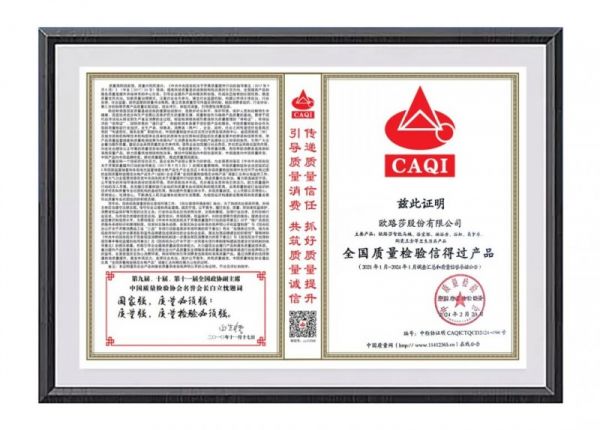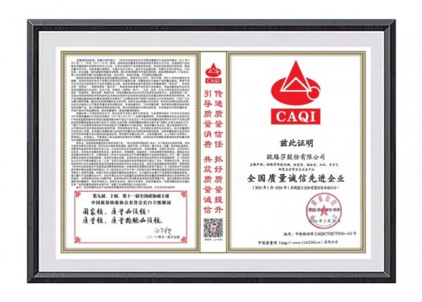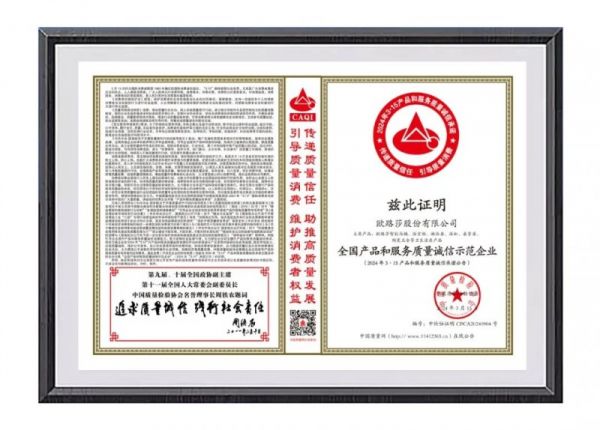 中国质量检验协会作为国家市场监督管理总局直属的全国产品质量监督检验领域唯一国家级质量专业机构,已连续20余年开展“产品和服务质量诚信承诺”主题活动,此次荣誉的获得是国家质量部门对欧路莎品牌形象、产品品质、服务口碑的高度认可。