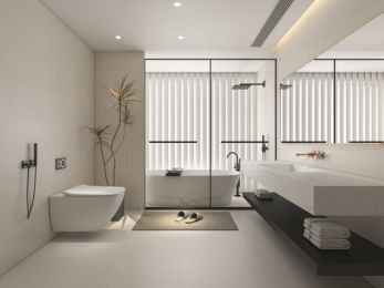茶室空间通过温暖的暖光灯和开放式布局获得了舒适性和亲切感,新中式木椅增添了一抹现代感,而黑白大花纹奢石则为室内带来了艺术气息。卫浴空间以纯白风格为主,墙面与地面均采用了简洁白色系奢石,在纯粹的视觉感受中,沉淀出微妙的平衡与记忆,更在光影的映衬下展现出独特的美感。