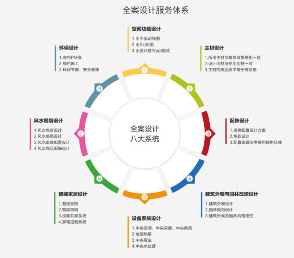 而在全案设计服务体系中,拉齐娜特有的八大系统则包括空间功能设计、主材设计、环保设计、风水规划设计、智能家居设计、设备系统设计、建筑外观与园林改造设计、配饰设计。