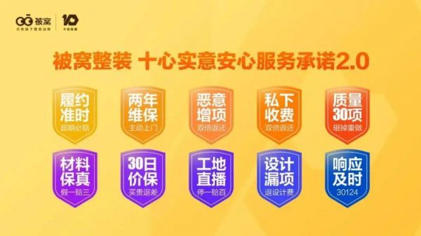 为提升家装服务品质,被窝整装4月10日发布“十心实意安心服务承诺2.0”,距离2021年9月推出的1.0版本过去两年半,其服务承诺覆盖范围更广、更具人性化,此外还增加了“30日价保,买贵退差”、“设计漏项,退设计费”、“响应及时,30124”等新内容。