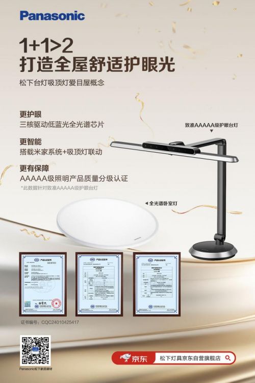 在现代家居中,照明不仅是为了提供光线,更是营造舒适生活环境的重要元素。为此,松下推出了全新的台灯吸顶灯产品,达到了松下爱目屋标准,实现了吸顶灯与台灯的双联动,为用户打造了全屋舒适护眼光的理想解决方案。