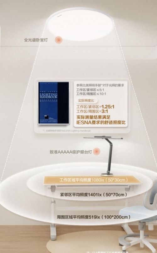松下台灯吸顶灯双联动设计采用了先进的光学技术,打造专业的读写照明舒适亮度,其实际照度比,工作区/周围区=3:1,实际测量结果(松下照明实验室检测获得)满足北美照明手册要求的照度舒适比(工作区/周围区≤10:1),光线均匀柔和。