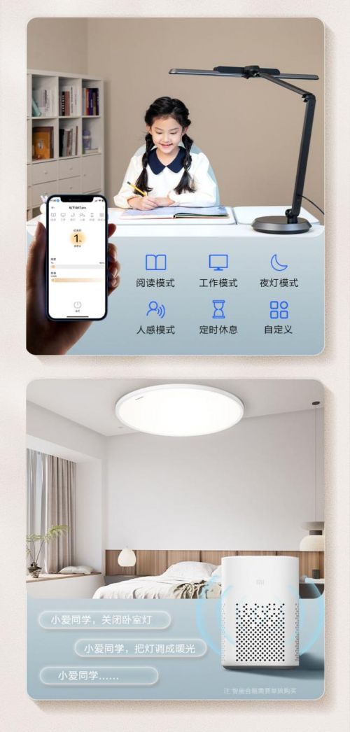 松下台灯吸顶灯产品还搭载了米家APP智控系统,支持语音操控,可以实现模式调节、自动调光、定时休息等功能,让用户能够更加智能的使用灯光。