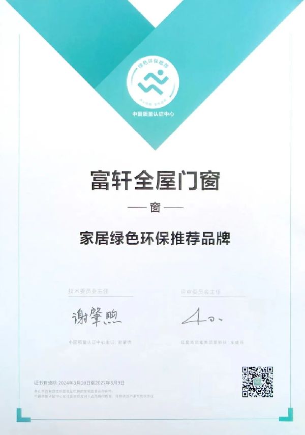 2024年4月,富轩全屋门窗获得由中国质量认证中心和红星美凯龙联合评审颁发的“家居绿色环保推荐品牌”,再次对富轩在践行绿色低碳节能这条道路上作出了高度评价和认可。