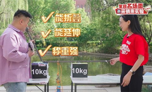 采销人员在两个桌子中间放上折叠款晾衣架,悬挂20公斤的水桶,晾衣架不变形、不坍塌,不仅能折叠,长度还能自由调节,承重力不在话下。