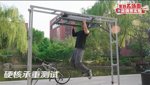 在承重力极端测试中,最引人注目的,莫过于160斤的骑行肌肉男,在晾衣架上默念1234...完成了数十个引体向上的操作,接着肌肉男更是将自己的爱车如同一件轻飘飘的衣物,悬挂在晾衣架上。