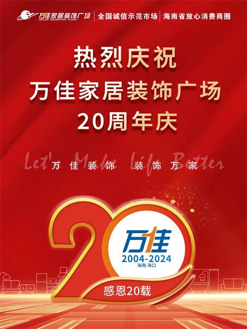 作为海南家居建材行业的龙头企业,海南省首批五星放心消费商圈。海南万佳广场家居装饰广场迎来了盛大的20周年庆典活动,为感谢广大顾客长期以来的支持与厚爱,特别策划了一系列丰富多彩的活动,让顾客在构建理想家的同时也能享受到一系列前所未有的家居购物体验。